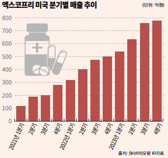엑스코프리는 지난해 매출이 폭발적으로 늘었다. 엑스코프리가 지난해 미국에서 올린 분기별 매출은 ▲1분기 539억원 ▲2분기 634억원 ▲3분기 757억원 ▲4분기 777억원이다. 지난해 미국 매출은 2708억원으로, 2022년 보다 무려 60.1% 늘었다.