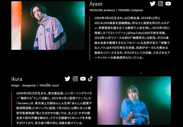 요아소비는 작곡가 아야세(Ayase)와 보컬 이쿠라(ikura)의 2인조 유닛으로 ‘소설을 음악으로 만들어낸다’는 콘셉트를 앞세운 그룹이다. 2019년 11월 발표된 요아소비의 데뷔곡 ‘밤을 달리다’는 공개 직후 전 세계의 팬덤을 만들 정로로 많은 사랑을 받았다. 이후 지난해 5월 발매한 곡인 ‘IDOL(아이돌)’은 빌보드 재팬 차트에서 역사상 최단 시간 6억회 스트리밍이라는 기록을 세웠다.
