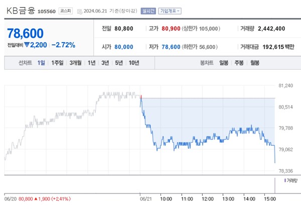KB금융은 전거래일 대비 2.72%(2200원) 내려 7만8600원으로 장을 마감했고 우리금융지주는 전거래일 대비 0.84%(120원) 하락해 1만4240원으로 장을 마쳤다.