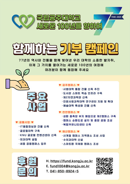 국립 공주대는 "국립 공주대 77년, 새로운 100년을 향하여"라는 슬로건 아래 발전기금 77억원을 목표로 기부 캠페인을 추진하고 나섰다고 27일 밝혔다.
