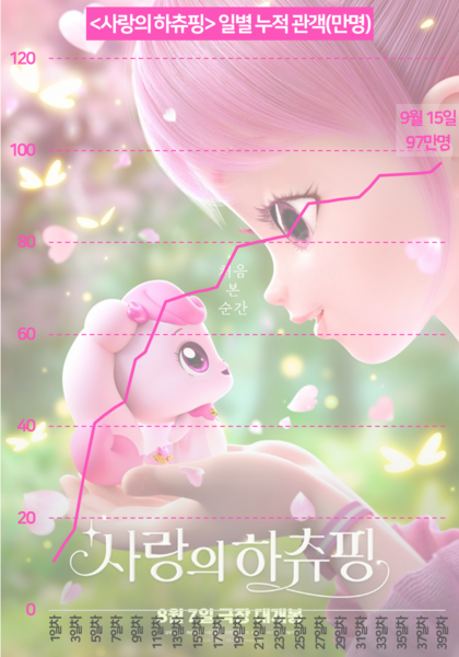 뽀로로도 못한 100만 관객 돌파를 하츄핑이 해낸다. <사랑의 하츄핑>(8월 7일 개봉)이 드디어 100만 관객을 돌파한다. 빠르면 오늘(15일), 늦어도 내일(16일) 낮 시간대 돌파가 확실시 된다.