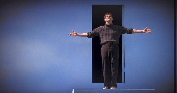 하늘색과 흰색으로 칠해진 세트장 벽이었죠. 트루먼은 협착한 길을 걸어가다 계단과 좁은 문을 발견합니다. 세트장 밖으로 나가는 비상문이었죠. “세상 밖으로” 나가는 그 문을 엽니다. 그때, 하늘에서 목소리가 들립니다.
