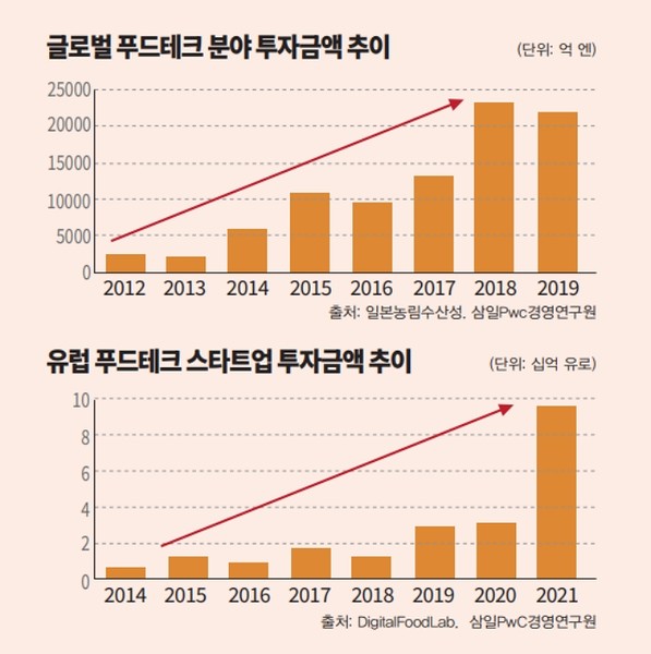 우리 정부의 본격적인 푸드테크 산업 투자는 세계적인 흐름과 비교하면 결코 빠르지 않다. 삼일PwC경영연구원이 2022년 일본농림수산성 자료를 인용해 발표한 ‘글로벌 푸드테크 분야 투자금액 추이’에 따르면 2012년 5000억엔 이하에서 2018년 2만5000달러 육박할 정도로 증가했다. 동시기 삼일이 디지털푸드랩 자료를 분석한 결과 유럽 푸드테크 스타트업 투자금액은 2014년 10억유로에도 못 미쳤으나 2021년에는 100억달러에 가까워지며 7년만에 10배 가까이 상승한 모습 나타냈다. 전세계적으로 푸드테크에 대한 높은 관심으로 풀이된다.