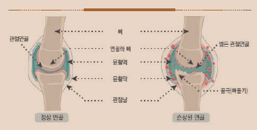 무릎을 이루는 연골, 인대, 근육, 힘줄 모두 소중하게무릎은 어깨와 함께 움직임이 많고 체중의 부하가 그대로 전달되어 부담을 받기에 쉽게 닳고 약해진다. 한 번 아프면 회복하기가 쉽지 않기 때문에 아프기 전에 미리미리 관절을 보호하는 습관이 필요하다.퇴행성 무릎관절염이란 윗다리와 아랫다리 사이에 있는 무릎뼈를 싸고 있는 연골. 보통 물렁뼈라고 하는데 이 물렁뼈가 닳거나 찢어진 것을 퇴행성 무릎관절염이라고 한다. 무릎을 굽히고 펴는 데는 힘줄, 관절액, 관절낭, 뼈, 인대, 연골 등이 긴밀하게 움직인다.연골이 닳아도 통증을 느끼지 못한다 물렁뼈인 연골은 관절을 구성하는 뼈끝을 싸고 있다. 우리 몸이 걷거나 움직일 때 충격을 완화하고 부드럽게 움직이도록 한다. 그러나 연골에는 신경세포가 없어 닳거나 찢어져도 통증을 바로 느낄 수 없어 뼈가 노출된 후에야 비로소 통증을 느낄 수 있다. 또한, 혈관이 없어 활액막에서 분비되는 관절액에서 확산을 통해 영양을 공급받는다. 즉 스스로 재생해 치유하는 능력이 없다. 손상될 때까지 잘 모르고, 알아도 치유하기 어려운 이유다.