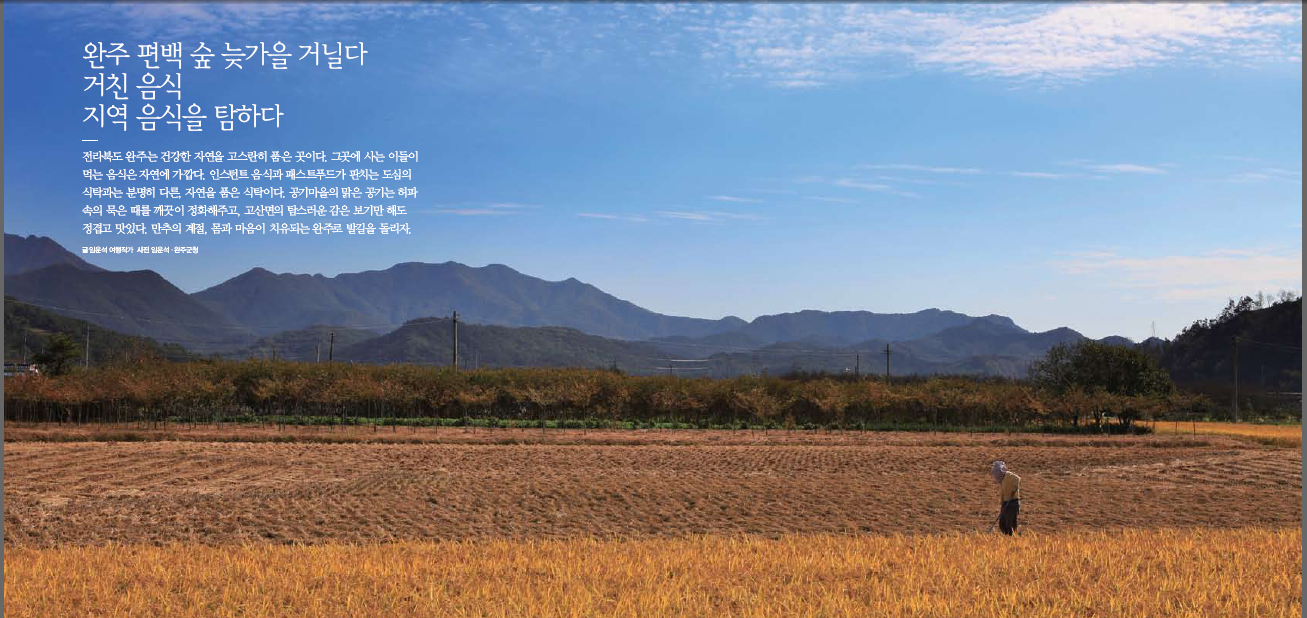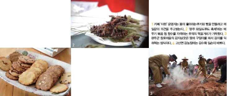 완주 고산자영휴양림에서 열린 ‘완주 와일드푸드 축제’로 자리 를 옮겨보자. 지난 10월 12일부터 14일까지 열린 축제에는 지금 은 혐오식품쯤으로 치부해버리는 개구리 뒷다리 구이와 메뚜기 볶음 등 향수를 자극하는 추억의 먹을거리가 가득했다. 난생 처 음 보는 음식을 놓고 아이들은 호기심과 두려움이 교차하는 표 정이다. 자연 속에서 맛을 찾아내는 야생음식들은 이곳 축제에서만 볼 수 있는 특별한 풍경이다. 그중에서 완주군 창포마을의 감자삼 굿이란 요리법 시연장에는 많은 사람이 몰려들어 줄 서기에 여 념이 없었다. 요리법은 이렇다. 우선 땅에 구덩이를 파고 그 위 에 철근을 올린다. 철근 위에 돌을 올리고 불을 지펴 돌을 뜨겁 게 달군다. 돌이 충분히 달궈지면 철근을 빼내고 감자, 고구마,옥수수 등을 넣고 그 위에 쑥, 솔잎 등을 덮고 다시 열이 빠져나 가지 못하도록 황토를 덮어서 익히는 방법이다. 완주군에서 맛볼 수 있는 독특한 와일드푸드의 공통점은 바로 ‘건강 먹을거리’라는 점. 거친 듯하지만, 자연의 것을 원하는 우 리 몸에 가장 적합한 음식이다.