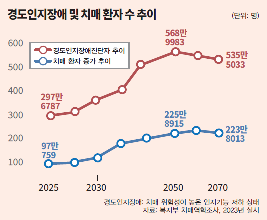 우리나라 치매머니가 약 154조원으로 국내총생산(GDP)의 6.4%인 것으로 집계됐다. 대통령 직속 기구로 관련 정책을 총괄하는 저출산고령사회위원회가 집계한 결과다. 지난 2023년 기준으로 만 65세 이상 치매환자가 보유한 자산이 그렇다. 2050년엔 GDP의 15.6%인 488조원을 돌파할 전망이라는 예측도 나왔다.