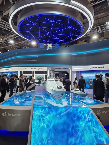 전시회에서 가장 큰 통합부스를 꾸린 한화 방산 3사는 한화오션-시스템-에어로스페이스로 이어지는 차세대 해양 통합 솔루션을 제시했다.
