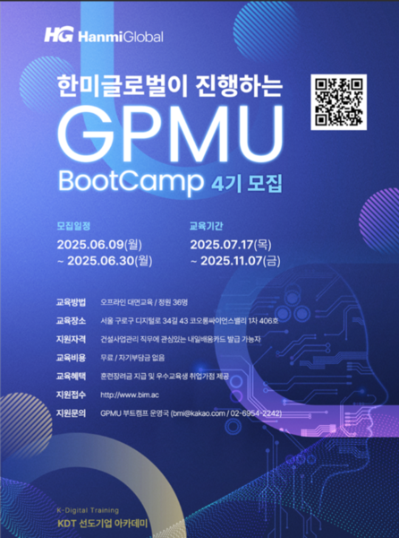국내 1위 PM(건설사업관리) 전문기업 한미글로벌이 디지털융합 건설사업관리 실무인재 양성을 위한 'GPMU 부트캠프' 4기 수강생을 오는 6월 30일까지 모집한다고 11일 밝혔다.