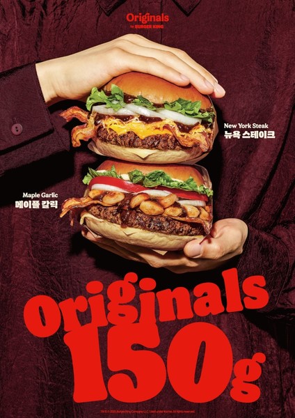 버거킹이 세계 각국의 미식 요소를 버거로 재해석해 선보이는 ‘오리지널스 150g’은 서로 다른 매력을 지닌 두 가지 메뉴로 만나 볼 수 있다. ‘오리지널스 메이플 갈릭’은 달콤한 메이플 시럽에 참나무로 훈연한 베이컨과 통마늘을 더해 ‘단짠’의 조화로운 밸런스를 완성했다. ‘오리지널스 뉴욕 스테이크’는 정통 스테이크하우스에서 영감을 받은 클래식 스테이크 소스에 부드럽고 크리미한 몬테레이 잭 치즈를 더해 미국 본토의 맛을 구현했다.