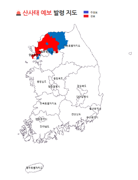 산림청은 13일 17시 기준 집중호우로 인한 산사태 위험이 커짐에 따라 서울·인천·경기 13개 시·구 90개 동·읍·면에 산사태 주의보를 발령했다.