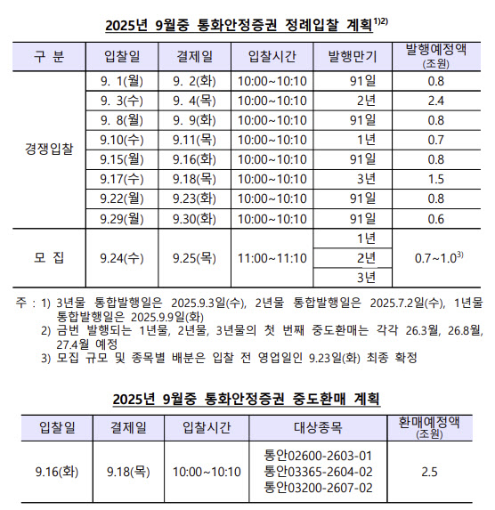 모집은 같은 달 24일 실시된다. 통화안정증권의 중도환매는 2조 5000억원 규모로 16일 입찰이 진행된다.