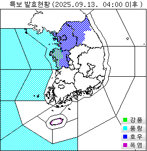 기상청은 9월 13일 오전 2시 발표를 통해 이날 오전 4시 이후 서울, 인천, 세종과 경기 전역, 충남 대부분 지역, 강원 일부 지역에 호우주의보를 발효한다고 밝혔다.