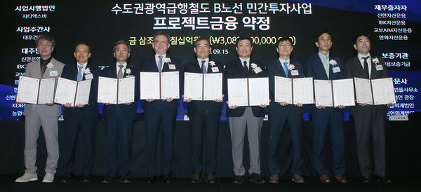 신한은행은 ‘GTX-B 노선 민간투자사업’의 대표 금융주선기관으로서 프로젝트 파이낸싱(PF)을 마무리하고 15일 프로젝트금융 약정식을 개최했다. 이날 약정식에는 대표 금융주선기관인 신한은행과 IBK기업은행, 교보생명보험, 주요 금융기관, 대우건설 관계자들이 참석했다.