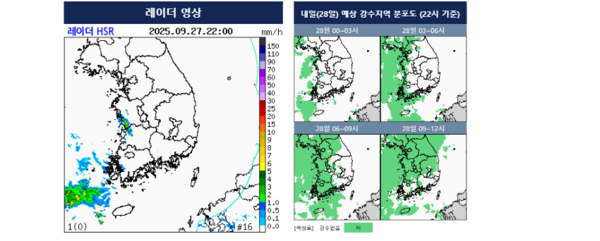 기상청은 28일 0시부터 6시 사이 수도권에 비가 내리고, 오전 6시부터 낮 3시까지 전국으로 확대되겠다고 예보했다.