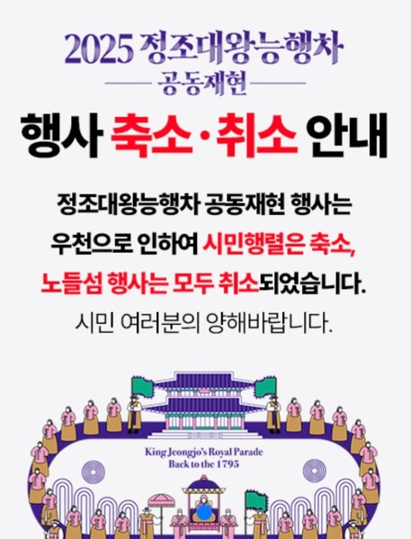 9월 28일(일) 열릴 예정이던 2025 정조대왕능행차 공동재현 행사가 비로 인해 일부 일정이 취소됐다.