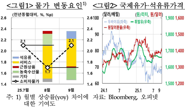 품목별로 보면 석유류 가격은 지난해 유가 하락에 따른 기저효과로 1년 전보다 2.3% 올라 상승 전환했다. 8월에는 1.2% 하락했었다. 서비스 물가도 공공서비스를 중심으로 오름폭이 확대됐다. 8월 1.3%였던 서비스물가 상승률은 9월 2.2%를 기록했는데, 통신요금 할인 효과가 사라진 영향이 컸다.