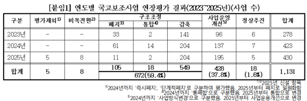 3년간 평가 결과를 세부적으로 보면 전체 1131개 사업 중 ‘폐지’ 105개(9.3%), ‘통합’ 18개(1.6%), ‘감축’ 549개(48.5%)였다. ‘사업운영 개선’은 428개, ‘정상추진’은 18개였다.