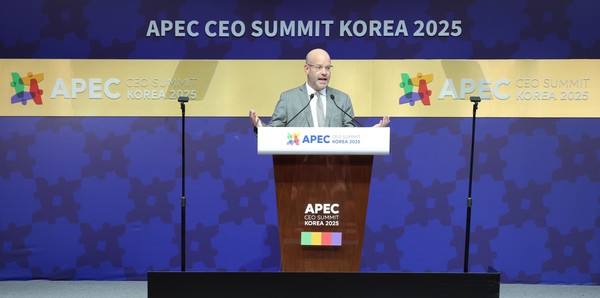 APEC CEO 서밋 코리아 2025의 주제 '연결 비즈니스 그 너머(Bridge, Business, Beyond·3B)' 중 '비즈니스'를 다룬 30일 에릭 에벤스타인 틱톡 미주 공공정책 총괄이 기조연설자로 나섰다.