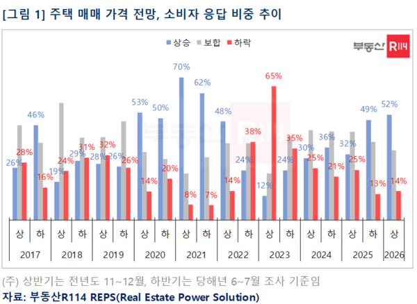 5일 부동산R114에 따르면 전국 1458명을 대상으로 '2026년 상반기 주택 시장 전망' 설문조사를 실시한 결과 응답자의 52%가 내년 상반기 주택 매매 가격이 오를 것으로 전망했다. 이는 2021년 하반기 전망 조사에서 상승 전망이 62%를 기록한 이후 5년여 만에 가장 높은 수치다. 하락한다는 응답은 14%, 보합 전망은 34%였다.