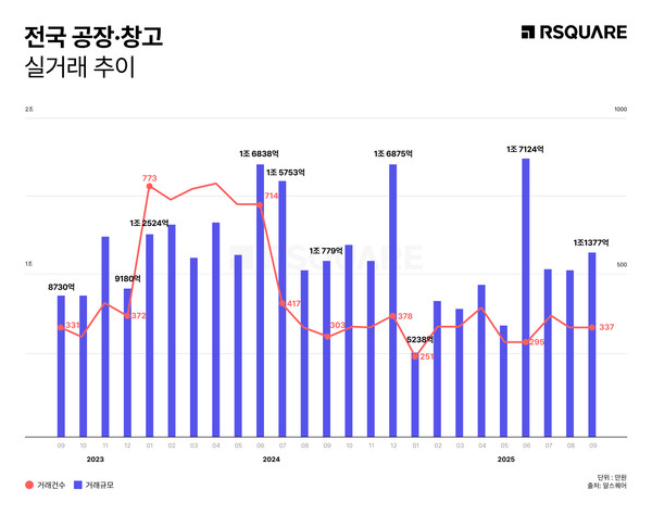 자료에 따르면 지난 9월 전국 공장·창고 거래규모는 1조1377억원 거래건수는 337건으로 집계됐다. 이는 7월 이후 3개월 연속 1조원대 초반 수준을 유지한 수치다.