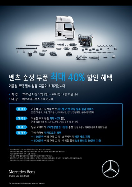 고객 감사 혜택으로 사은품도 증정한다. 캠페인 참여 고객에세 모바일 상품권 1만원권을 제공하고 11만원 이상 유상 서비스 및 수리부품 구매 고객에게는 방한세트, 500만원 이상 구매 고객에게는 메르세데스-벤츠 트럭 포인트 50만원을 제공한다.