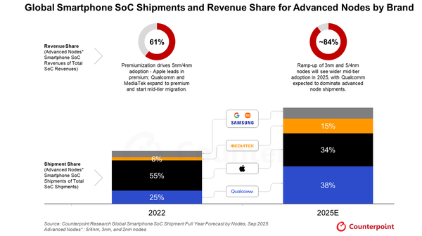 카운터포인트리서치는 첨단 공정 비중 확대로 퀄컴과 미디어텍이 수혜를 입을 것으로 분석했다. 퀄컴은 4G 비중이 낮고, 자사 중저가 5G SoC 대부분을 4·5나노 공정으로 이전 중이어서 추가적인 이익이 기대된다.