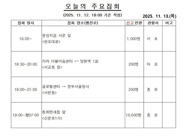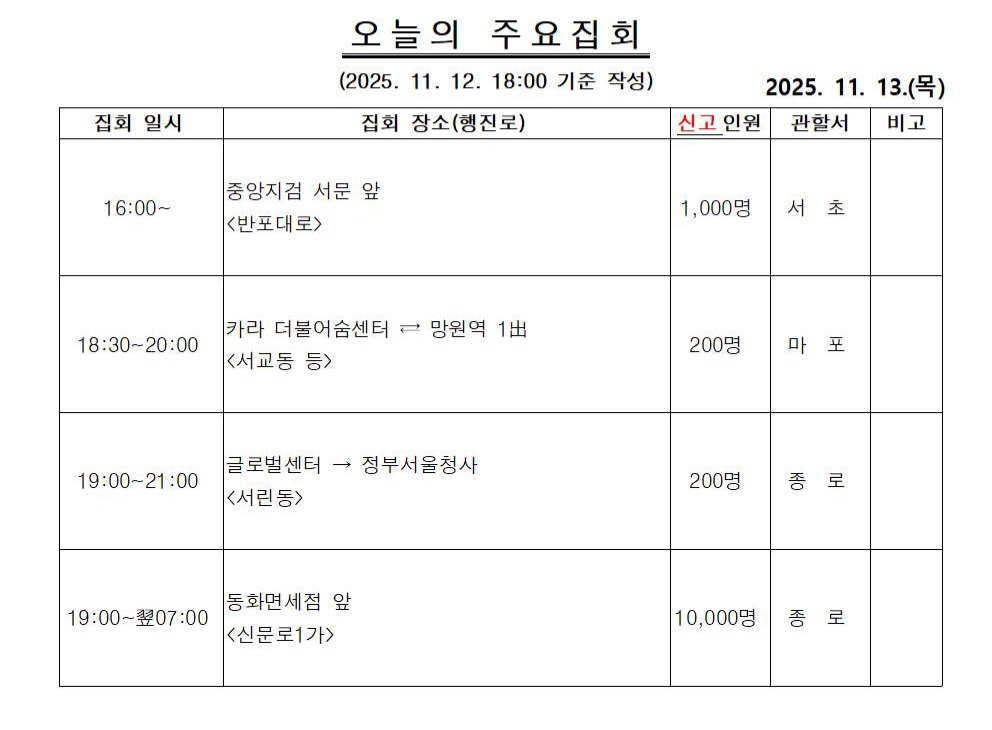 수능일인 11월 13일에 신고된 서울 집회는 4건이다. 가장 빠른 집회는 오후 4시 중앙지검 서문 앞 1000명이다. 최대 규모는 저녁 7시 동화면세점 앞 1만명이다.