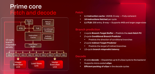 페치 파이프라인은 192KB에 달하는 L1 명령어 캐시(I-cache)를 품고 있으며 이는 CPU가 한 번에 처리할 수 있는 명령어의 양을 극대화하려는 전략이 엿보인다. 이렇게 가져온 명령어는 '9-wide 디코드' 유닛으로 공급된다. 한 사이클에 최대 9개의 명령어를 해석하여 CPU의 백엔드(실행 유닛)로 보낸다는 의미다. 일각에서는 지나친 자원 낭비라는 주장도 있으나 현 상황에서는 최적의 성과를 내려는 시도로 풀이된다.