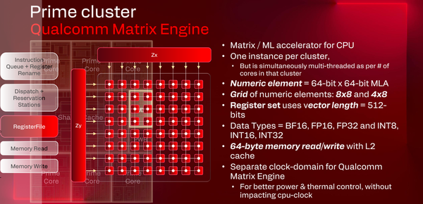 핵심 승부수는 바로 매트릭스 엔진(Matrix Engine)이다. 당장 프라딥 카나파티필라 퀄컴 엔지니어링 부사장은 "이전 세대에는 없었던 CPU 자체의 매트릭스 가속기를 갖추고 있다"고 발표했다.