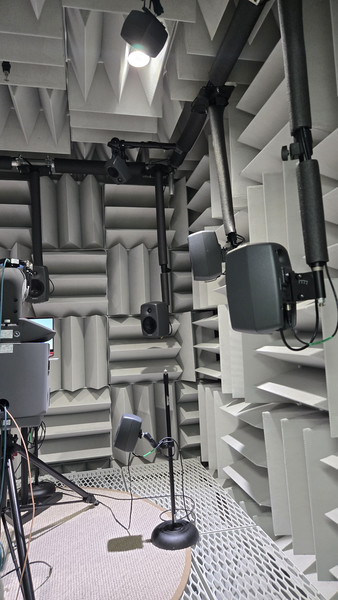 무향실에 들어서자 벽과 천장을 둘러싼 16개의 스피커와 중앙에 위치한 사람 형상의 헤드 앤 토르소 시뮬레이터(HATS)가 기묘한 분위기를 자아냈다.