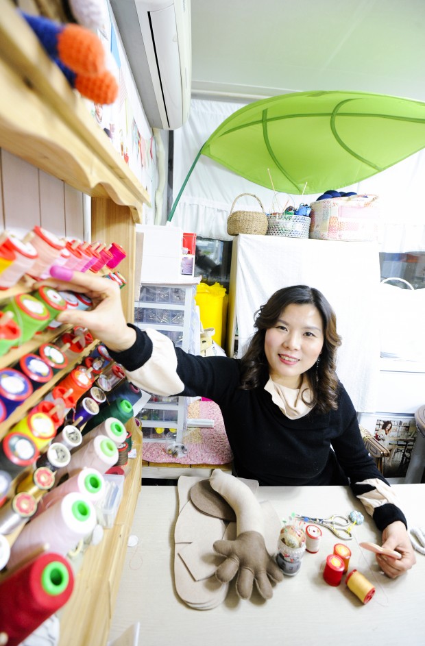 그 후로는 적성을 살리지 못한 채 살았다. 결혼 전에는 은행에서 일했고 결혼 직후에는 전업주부로 충실했다. “남편이 직업군인이었던지라 관사에서 6년 동안 살았어요. 그 근처에 뭐가 있나요, 집에서 무료한 시간을 달래면서 조금씩 공예품을 만들기 시작한 거죠. 아이에게 핀 만들어 달아주고, 인형 만들어주고….”