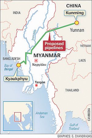 중국은 에너지 수송로의 확보를 위해 미얀마를 종단하는 송유관 건설에 착수했다.